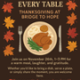 Bridge to Hope is looking for volunteers and donors to support our Thanksgiving Meal on November 26th, from 1–3 PM at 37–41 Bridge Street, Corning, NY. You can help by bringing a dish to share, donating ingredients, or volunteering your time to serve meals and spread warmth.